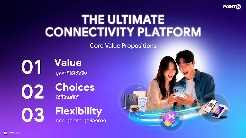 จากแนวโน้มดังกล่าว POINTX จึงอยากเข้ามาเปลี่ยนนิยามใหม่ให้กับพอยท์สะสม จากเดิมที่เป็นเพียง ‘ของรางวัลที่เข้าถึงยาก’ สู่ ‘มูลค่าที่ใช้ได้จริงในทุกวัน’ เพื่อทลายข้อจำกัด เพิ่มความคล่องตัว และทำให้ทุกคนสามารถนำพอยท์สะสมที่มีอยู่ไปใช้ในชีวิตประจำวันได้อย่างสะดวกและสร้างความคุ้มค่าได้อย่างแท้จริง”