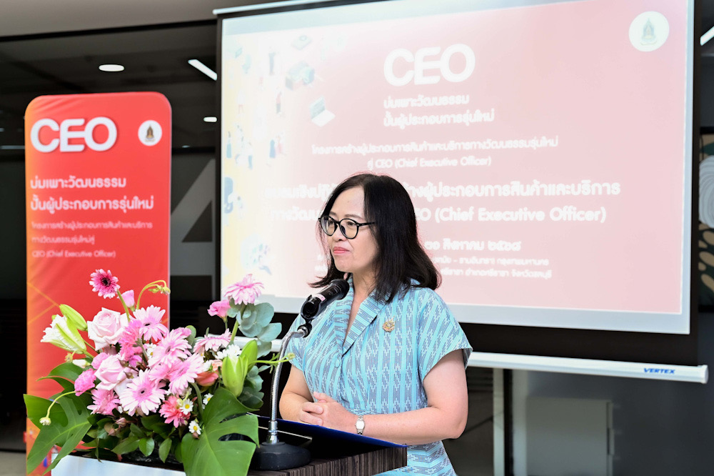 นางรักชนก โคจรานนท์ รองปลัดกระทรวงวัฒนธรรม ให้เกียรติเป็นประธานในพิธีเปิดการอบรมฯ ณ SCG HOME Experience โดยนางสาวผกาพรรณ แสนนรินทร์ นักวิชาการวัฒนธรรมชำนาญการพิเศษ ได้กล่าวรายงาน ในโอกาสนี้ นางรักชนก ได้กล่าวว่า การอบรมเชิงปฏิบัติการ การสร้างผู้ประกอบการสินค้าและบริการทางวัฒนธรรมรุ่นใหม่สู่ CEO (Chief Executive Officer) ภายใต้แนวคิด “CEO : Culture Empowers Opportunity – Youth Camp วัฒนธรรมสร้างโอกาส สู่ผู้นำรุ่นใหม่” ซึ่งสะท้อนถึงพลังของวัฒนธรรมในการสร้างโอกาสใหม่ ๆ ให้กับเยาวชนไทย โครงการนี้เป็นเวทีสำคัญในการพัฒนาศักยภาพของเยาวชนรุ่นใหม่ให้สามารถนำทุนทางวัฒนธรรมมาสร้างสรรค์เป็นสินค้าและบริการที่มีคุณค่า ตอบโจทย์ตลาดสมัยใหม่ และมีความยั่งยืนทั้งด้านเศรษฐกิจ สังคม และสิ่งแวดล้อม