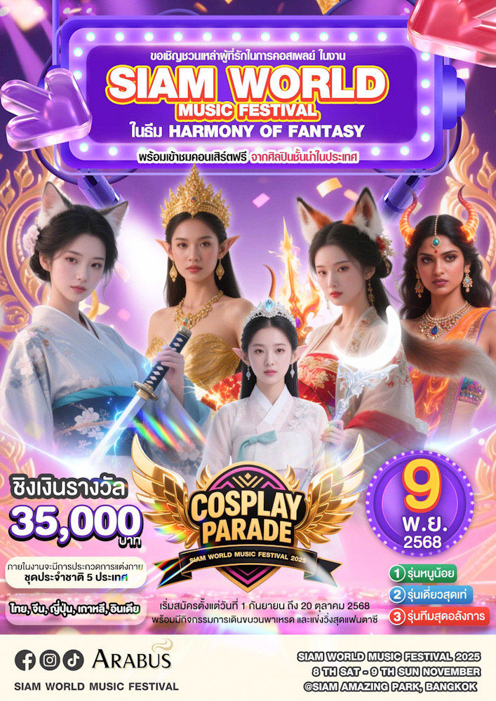 และอีกหนึ่งไฮไลต์ ที่ทุกคนรอคอยคือ การประกวดคอสเพลย์ในธีมชุดประจำชาติ ที่จะพาผู้เข้าร่วมแต่งกายในเอกลักษณ์ความงามของ 5 ชาติ ได้แก่ ไทย, เกาหลี, ญี่ปุ่น, อินเดีย และจีน พร้อมด้วย ขบวนพาเหรดแฟนตาซีสุดตระการตา ซึ่งการประกวดแบ่งออกเป็น 3 รุ่น ได้แก่ รุ่นหนูน้อย (อายุ 3–9 ปี) รุ่นเดี่ยว (อายุ 10 ปีขึ้นไป) และ รุ่นทีม (ไม่จำกัดอายุ) ชิงเงินรางวัลรวมกว่า 35,000 บาท เพื่อสร้างแรงบันดาลใจแก่ผู้เข้าประกวดและเน้นย้ำคุณค่าของวัฒนธรรมที่สะท้อนผ่านการแต่งกาย