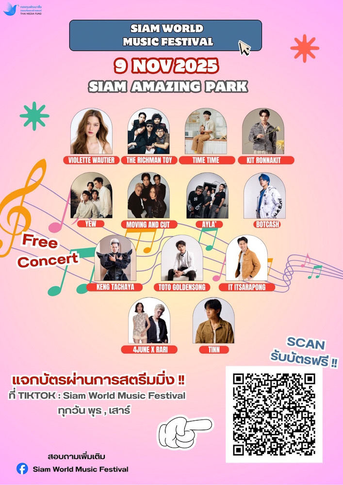 คุณณัฐรัชต์ จิระพลพนิต หัวหน้าโครงการ Siam World Music Festival เปิดเผยว่า งาน “Siam World Music Festival 2025” เทศกาลดนตรีและวัฒนธรรมสุดยิ่งใหญ่ เป็นฟรีคอนเสิร์ต ที่ได้รับการสนับสนุนจาก สำนักงานกองทุนพัฒนาสื่อปลอดภัยและสร้างสรรค์ เพื่อสร้างเวทีที่ผสมผสานพลังของดนตรี ศิลปะ และการท่องเที่ยวเข้าไว้ด้วยกันอย่างกลมกลืน นับได้ว่าเป็นการรวมตัวของศิลปินแนวหน้าของประเทศ ที่จะทำให้งานเทศกาลครั้งนี้เปี่ยมไปด้วยสีสันดนตรีที่หลากหลาย ตั้งแต่ไทย ป๊อปร็อก อินดี้ ไปจนถึงอิเล็กทรอนิกส์ และโชว์ที่ผสมผสานความร่วมสมัย