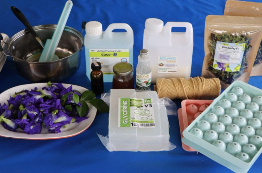 ภาพที่ 1 วัสดุอุปกรณ์ในการทำสบู่ไบโอชาดอกไม้ ต.ธารทอง อ.พาน จ.เชียงราย