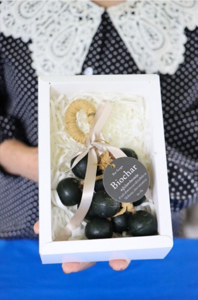 ผลผลิตจากไม้ดอกไม้ประดับดังกล่าวสามารถนำไปพัฒนาและต่อยอดเป็นผลิตภัณฑ์เพิ่มมูลค่า โดยหนึ่งในผลิตภัณฑ์ที่ได้รับความสนใจ คือ สบู่ไบโอชาร์พวงองุ่น ซึ่งพัฒนาโดยการใช้ประโยชน์จากเศษพืชเหลือใช้ผสมผสานกับสารสกัดสีและกลิ่นจากดอกไม้ที่เกษตรกรปลูกในพื้นที่ ทั้งยังมีการ ร่วมพัฒนาสูตรและออกแบบบรรจุภัณฑ์ เพื่อให้ได้ผลิตภัณฑ์ที่มีมาตรฐาน เหมาะสมต่อการจำหน่าย และเพิ่มศักยภาพทางการตลาดให้แก่ชุมชนท้องถิ่น อันเป็นการสร้างช่องทางรายได้ใหม่ ควบคู่กับการลดปริมาณของเสียทางการเกษตรที่เดิมอาจถูกกำจัดด้วยการเผา