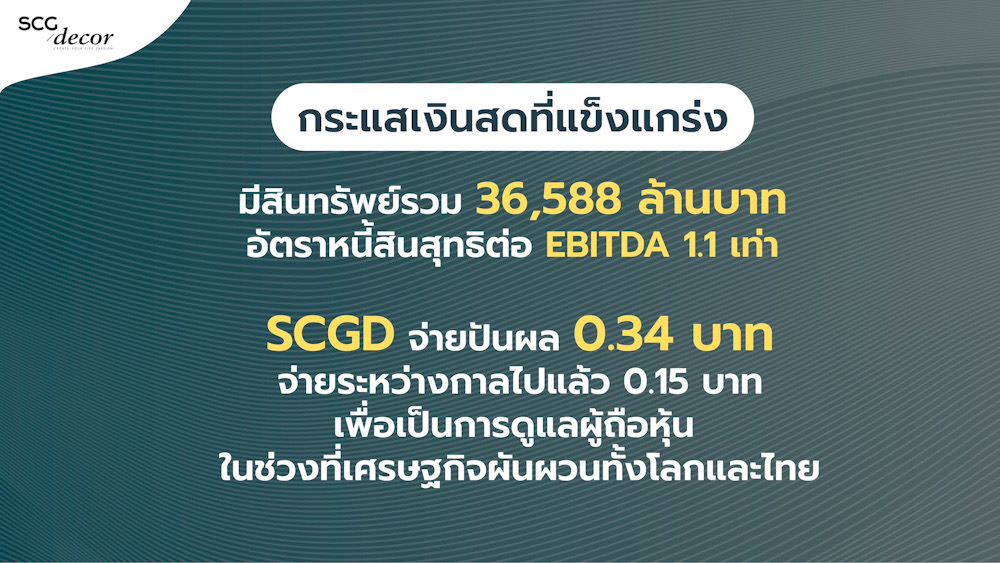 SCGD มีสินทรัพย์รวมทั้งสิ้น 36,588 ล้านบาท และยังคงความแข็งแกร่งทางการเงินด้วยอัตราส่วนหนี้สินสุทธิต่อ EBITDA ที่ 1.1 เท่า ลดลงจากไตรมาสก่อน และอัตราส่วนหนี้สินสุทธิต่อส่วนของผู้ถือหุ้นที่ 0.2 เท่า พร้อมเติบโตในระยะยาว รวมทั้งยังมีการจัดการเงินทุนและการใช้จ่ายอย่างรอบคอบ เน้นให้สอดคล้องกับแผนการเติบโตในอนาคต”