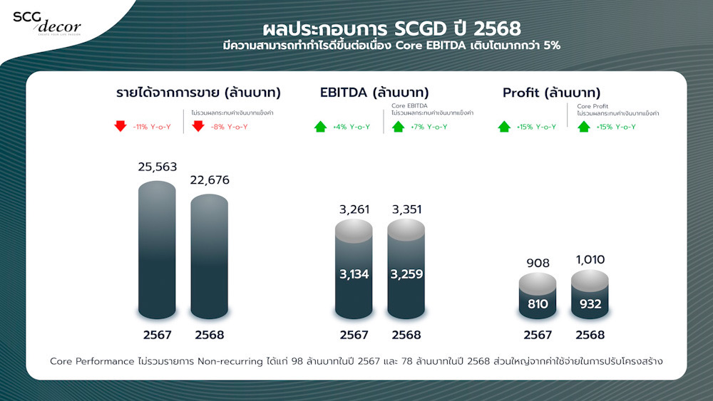นายนำพล มลิชัย ประธานเจ้าหน้าที่บริหารและกรรมการผู้จัดการใหญ่ บริษัทเอสซีจี เดคคอร์ จำกัด (มหาชน) หรือ SCG Decor (SCGD) ผู้นำธุรกิจวัสดุตกแต่งพื้นผิวและสุขภัณฑ์ในภูมิภาคอาเซียน กล่าวว่า “ผลประกอบการไม่รวมรายการพิเศษ ปี 2568 EBITDA อยู่ที่ 3,351 ล้านบาท และมีกำไรสำหรับปีอยู่ที่ 1,010 ล้านบาท ปรับตัวเพิ่มขึ้น 3% และ 11% จากปีก่อน มีรายได้ 22,676 ล้านบาท ลดลง 11% จากปีก่อน และหากไม่รวมผลกระทบของค่าเงินบาทแข็งค่าด้วยแล้ว EBITDA และกำไรสำหรับปีจะดีขึ้น 7% จากปีก่อน และ 15% จากปีก่อน ตามลำดับ
