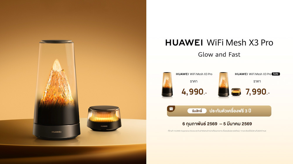 ใครที่สนใจ สามารถเป็นเจ้าของ HUAWEI WiFi Mesh X3 Pro ได้แล้ววันนี้ที่ราคา 4,990 บาท หรือซื้อเป็นชุด HUAWEI WiFi Mesh X3 Pro Suite ในราคา 7,990 บาท ซึ่งจะได้รับ HUAWEI WiFi Mesh X3 Pro และตัวกระจายสัญญาณ Extender พิเศษ เมื่อซื้อเราเตอร์ HUAWEI WiFi Mesh X3 Pro ภายในระยะเวลาโปรโมชัน ระหว่างวันที่ 6 กุมภาพันธ์ 2569 ถึงวันที่ 5 มีนาคม 2569 รับสิทธิ์ รับประกันตัวเครื่อง 3 ปี (นับจากวันที่ซื้อสินค้า) และรับประกันอุปกรณ์เสริม 1 ปี (เฉพาะอุปกรณ์เสริมที่มาในกล่องตามที่บริษัทกำหนด) โดยสามารถสั่งซื้อ HUAWEI WiFi Mesh X3 Pro ได้ที่หน้าร้าน HUAWEI Experience Store และร้านค้าที่ร่วมรายการ รวมถึงช่องทางออนไลน์อย่าง HUAWEI Store, Lazada, Shopee และ TikTok Shop