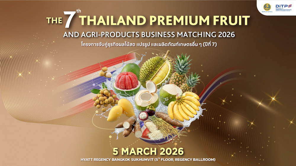กรมส่งเสริมการค้าระหว่างประเทศ (DITP) เตรียมจัดกิจกรรมจับคู่ธุรกิจสินค้าผลไม้สด ผลไม้แปรรูป และผลิตภัณฑ์เกษตรอื่น ๆ (ปีที่ 7)” เพื่อผลักดันผลไม้ไทยสู่ตลาดโลก งานจะจัดขึ้นในวันพฤหัสบดีที่ 5 มีนาคม 2569 ณ โรงแรมไฮแอท รีเจนซี่ กรุงเทพฯ สุขุมวิท